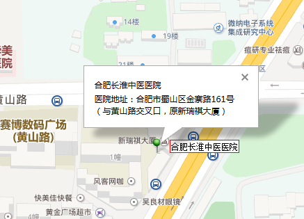 合肥长淮中医医院 0551-67115858 安徽省合肥市蜀山区金寨路161号(与黄山路交叉口,原新瑞祺大厦) 1、乘1、126、133、148、166、701、705、901到科技大学站下车; 2、乘10、102、108、118、121、129、158、501到合肥学院站下车; 1、步行50米坐1路在中国科技大学下车,即可到达合肥长淮中医医院; 2、步行50米坐226路在中国科技大学下车,即可到达合肥长淮中医医院; 3、步行50米坐10路在中国科技大学下车,即可到达合肥长淮中医医院; 1、步行590米胜明路口坐1路在中国科技大学下车,即可到达合肥长淮中医医院; 2、步行300米金大塘坐119路在安医附院下车,步行590即可到达合肥长淮中医医院; 3、步行10米坐145路到芜湖路下车,转乘226路到中国科技大学下车,即可到达合肥长淮中医医院。 1、来院就诊患者需带好身份证及其他可证明自己身份的证件 2、为避免当天挂不上专家门诊号 请提前免费网络或电话申请预约 3、援助活动仅限网络预约和电话预约的患者,自己来院不参与援助 为了防止患者到院后,医生号已满的现象频繁发生。合肥长淮中医医院温馨提示广大外地患者:就诊前请先点击咨询了解医生号详情,提前预约挂号。如果您有什么疑问可以免费与“在线医生”直接对话咨询或拨打免费咨询电话:0551-67115858了解详情。医院名称:
